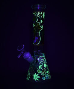 Aliens And Hemp Leaves Glow Glass Beaker Water Pipe-10″ / 14mm F / Designs Vary